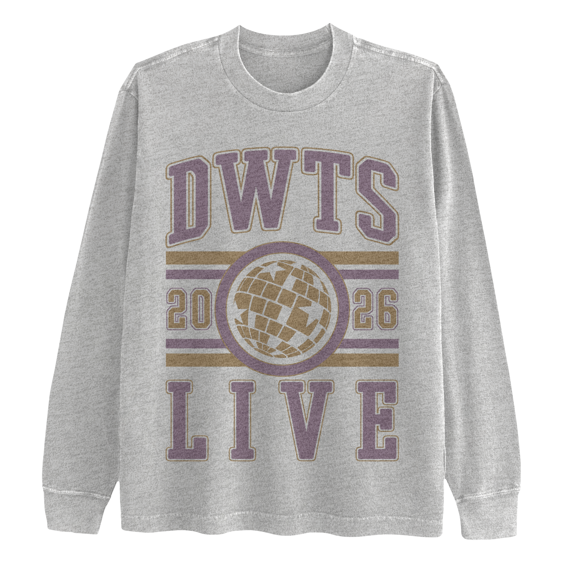 Heather Grey 100% cotton long sleeve tee with DaWTS Live 2026 logo on the front and mirrorball logo on the back