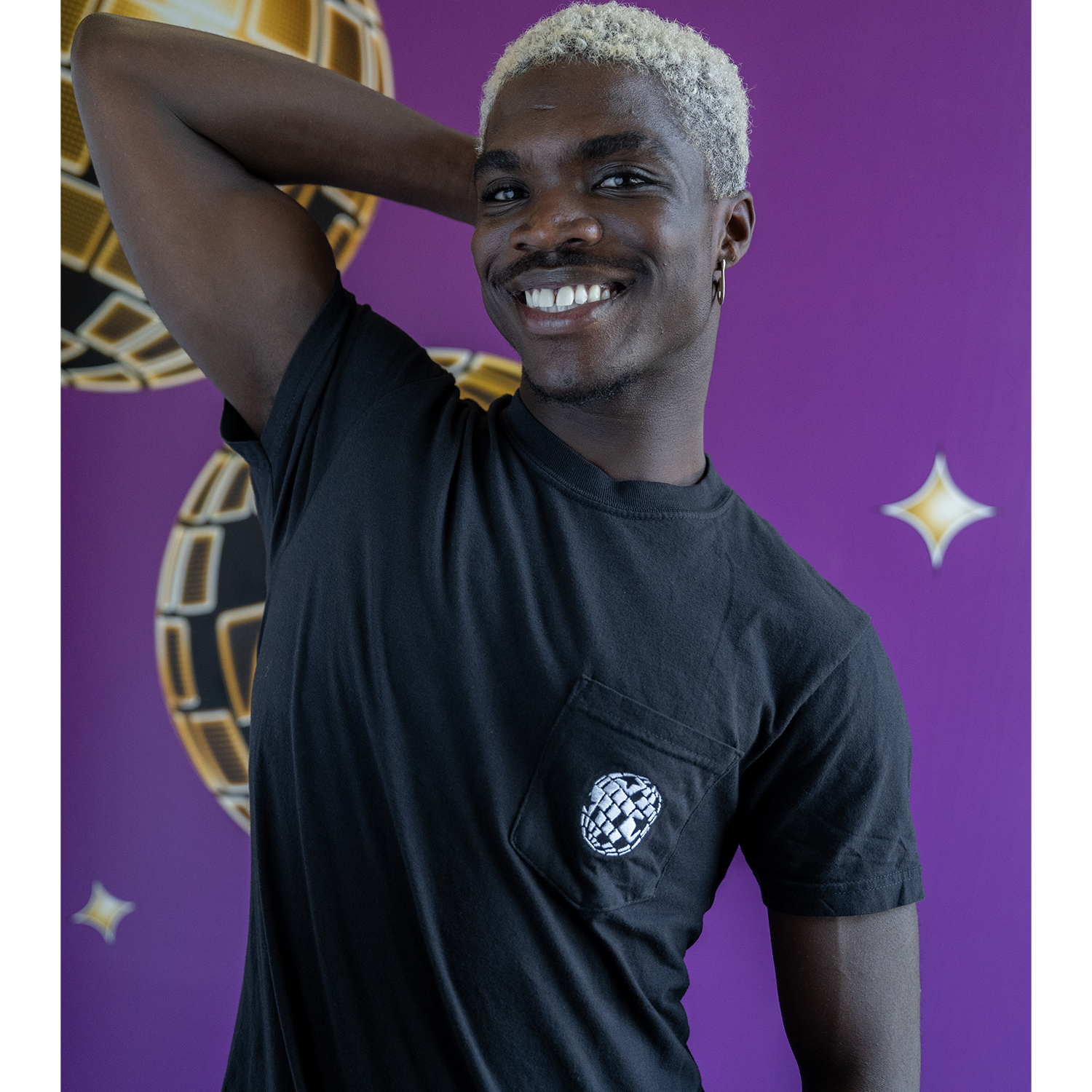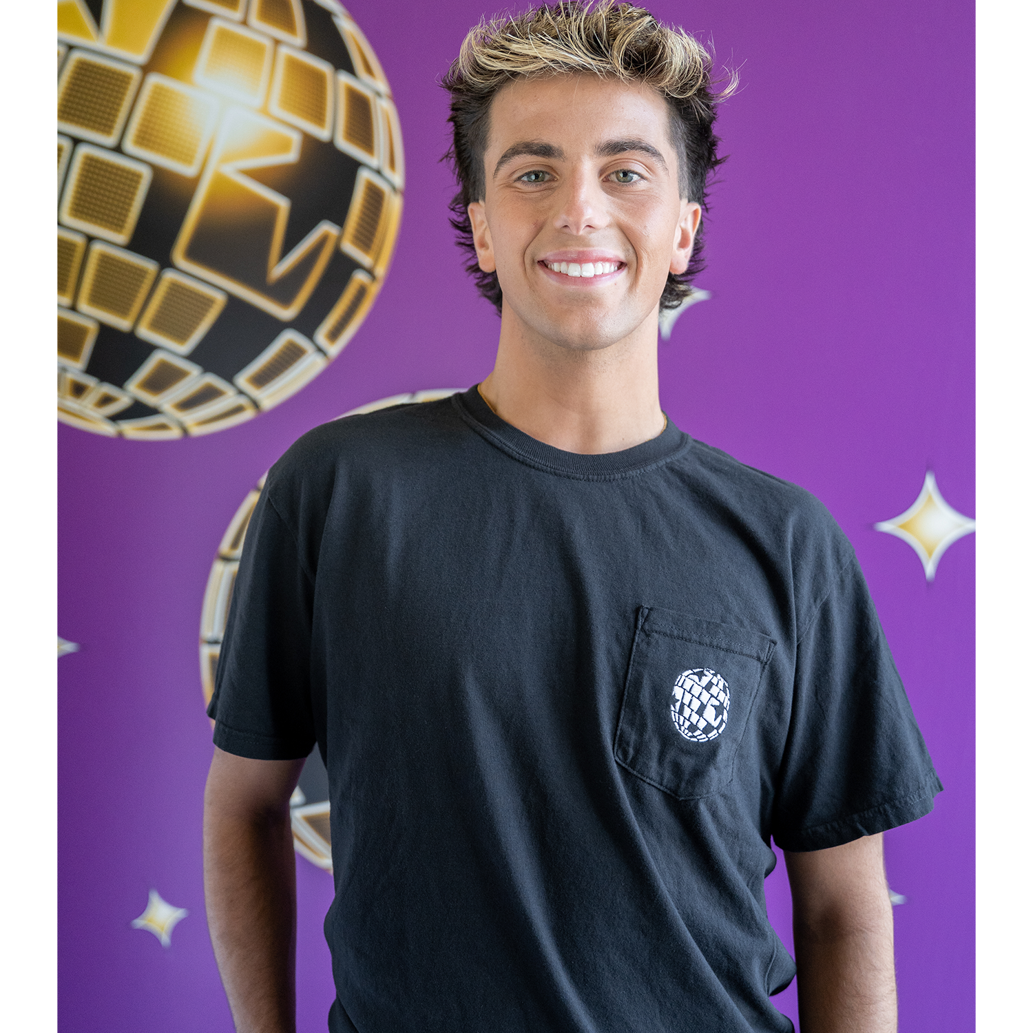 Black 100% cotton short sleeve tee with Mirrorball logo embroidered on the front pocket and DWTS Hollywood printed on the back