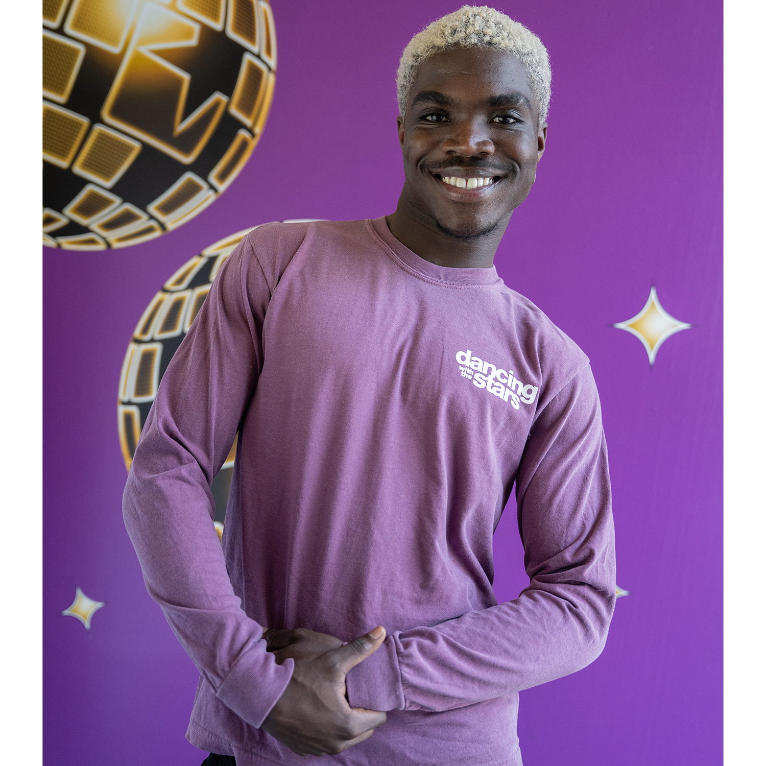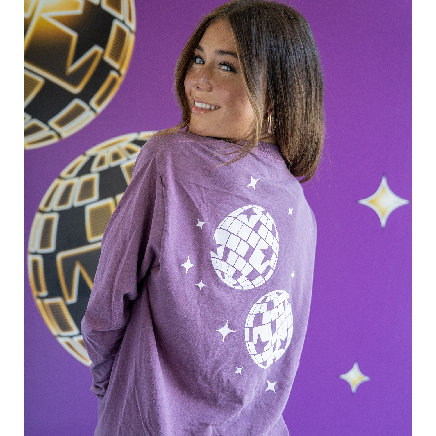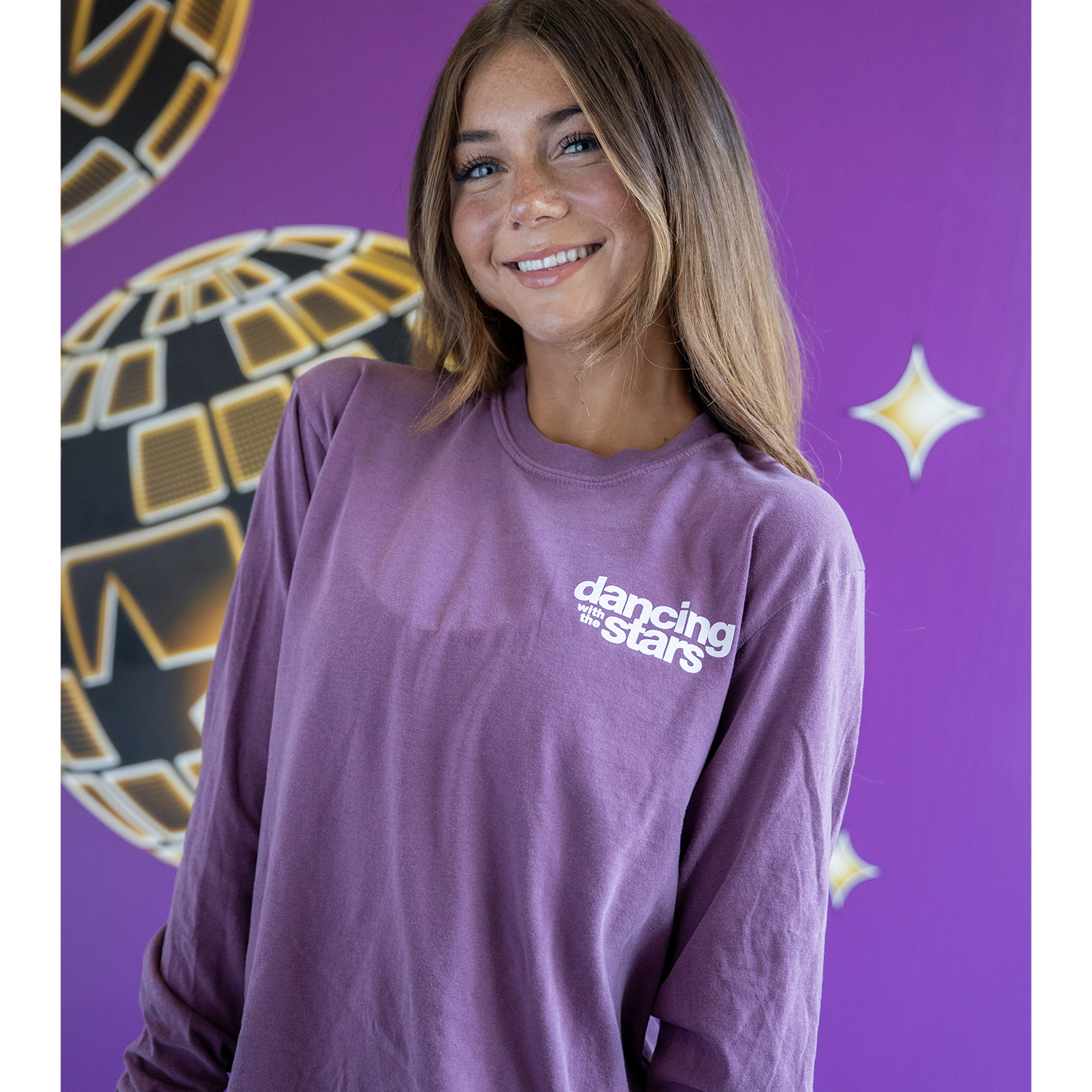 Berry 100% cotton long sleeve tee with Dancing With The Stars Logo printed on the front and mirrorballs printed on the back.