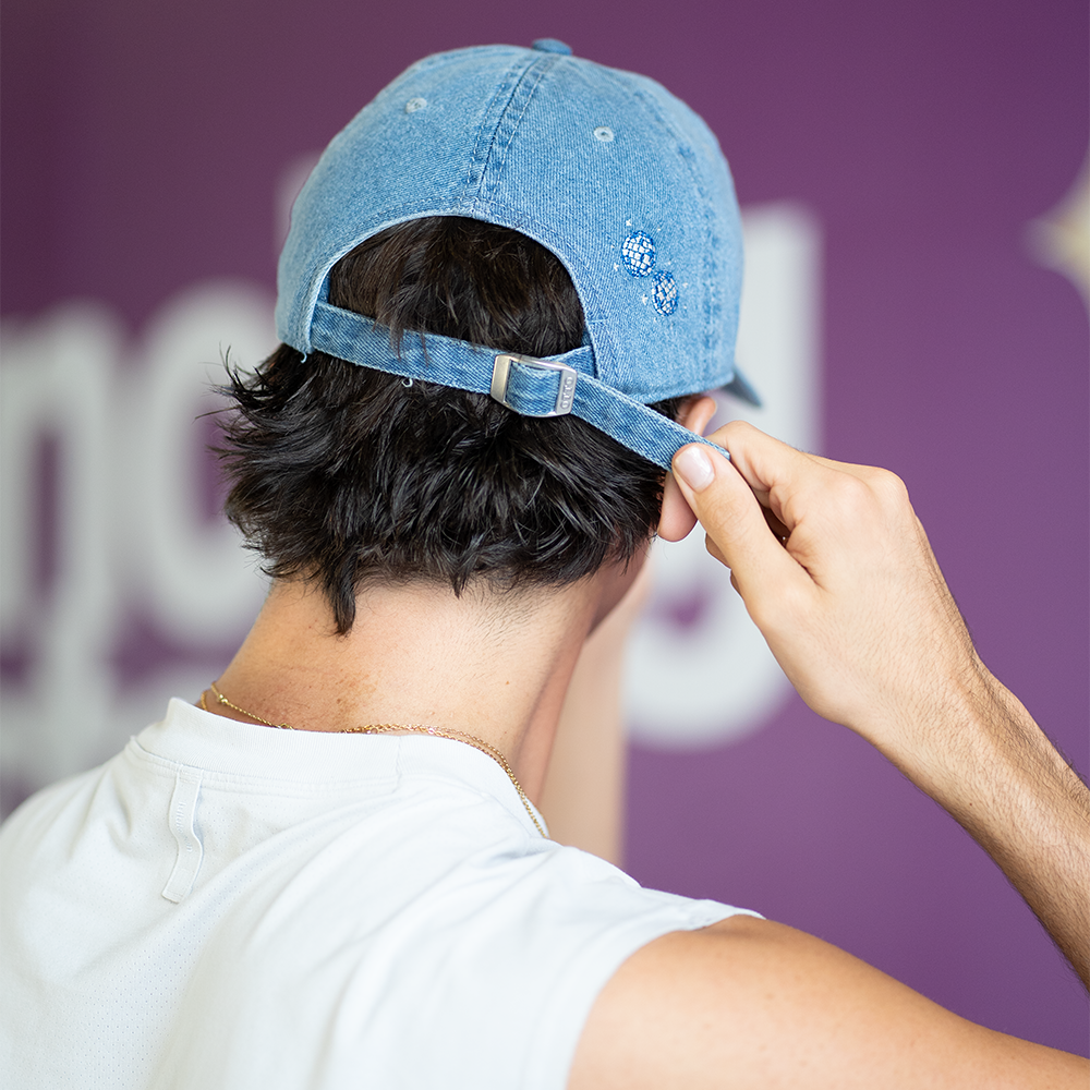 Denim hat with Live From Hollywood embroidered on the front and Mirrorball artwork embroidered on the back